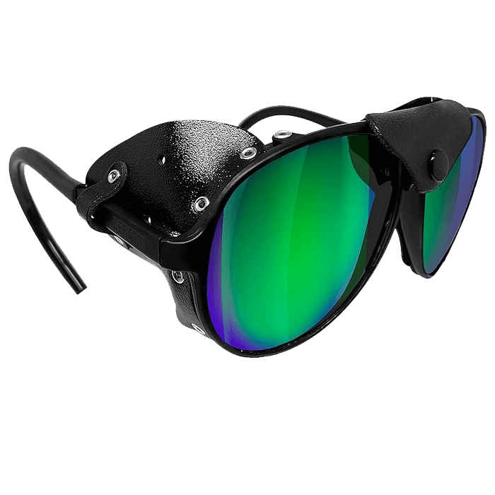 This is a pair of hikingglasses designed for use in extreme outdoor conditions. They offer protection from wind, harsh weather, and strong sunlight. The design includes leather side shields with aerators to prevent misting and a removable nose-bridge protector. The lenses are polarized to reduce glare from surfaces like snow and water, and they provide 100% UV protection. They are available in several polarized and photochromic lens options. The arms are flexible and curved for a secure fit that prevents slipping. The glasses come with a protective case, a microfiber cleaning pouch, and an elastic cord.